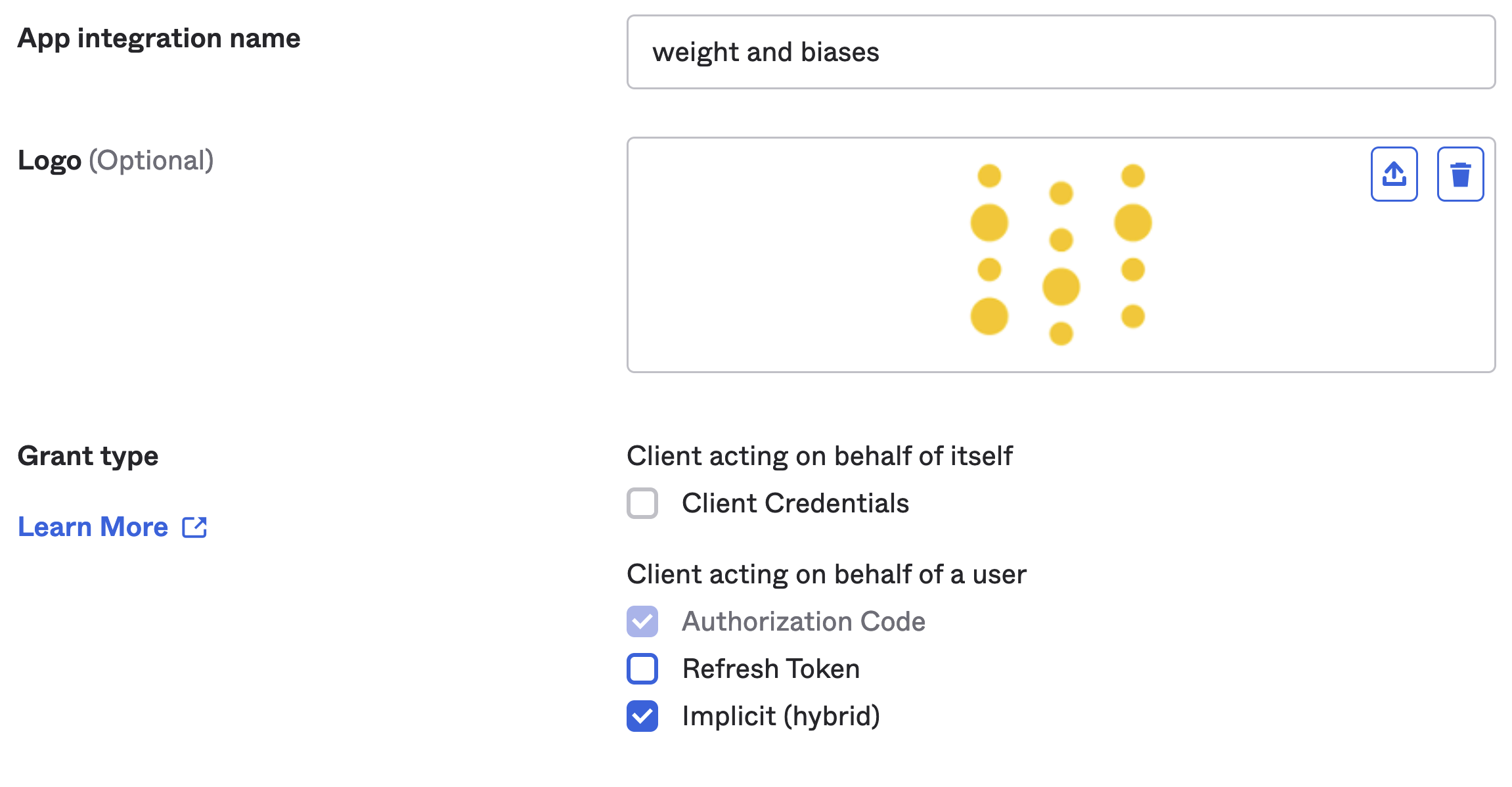 - App Integration name フィールドにアプリの名前を入力します。(例:Weights and Biases)