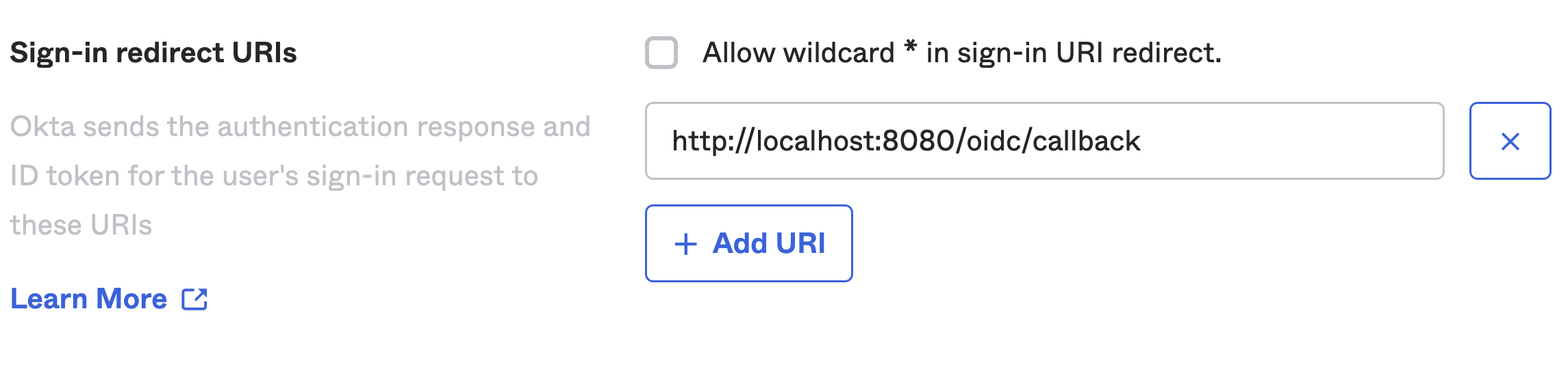 例として、アプリケーションがポート 8080 のローカルホストで実行されている場合(https://localhost:8080)、リダイレクト URI は https://localhost:8080/oidc/callback のようになります。
