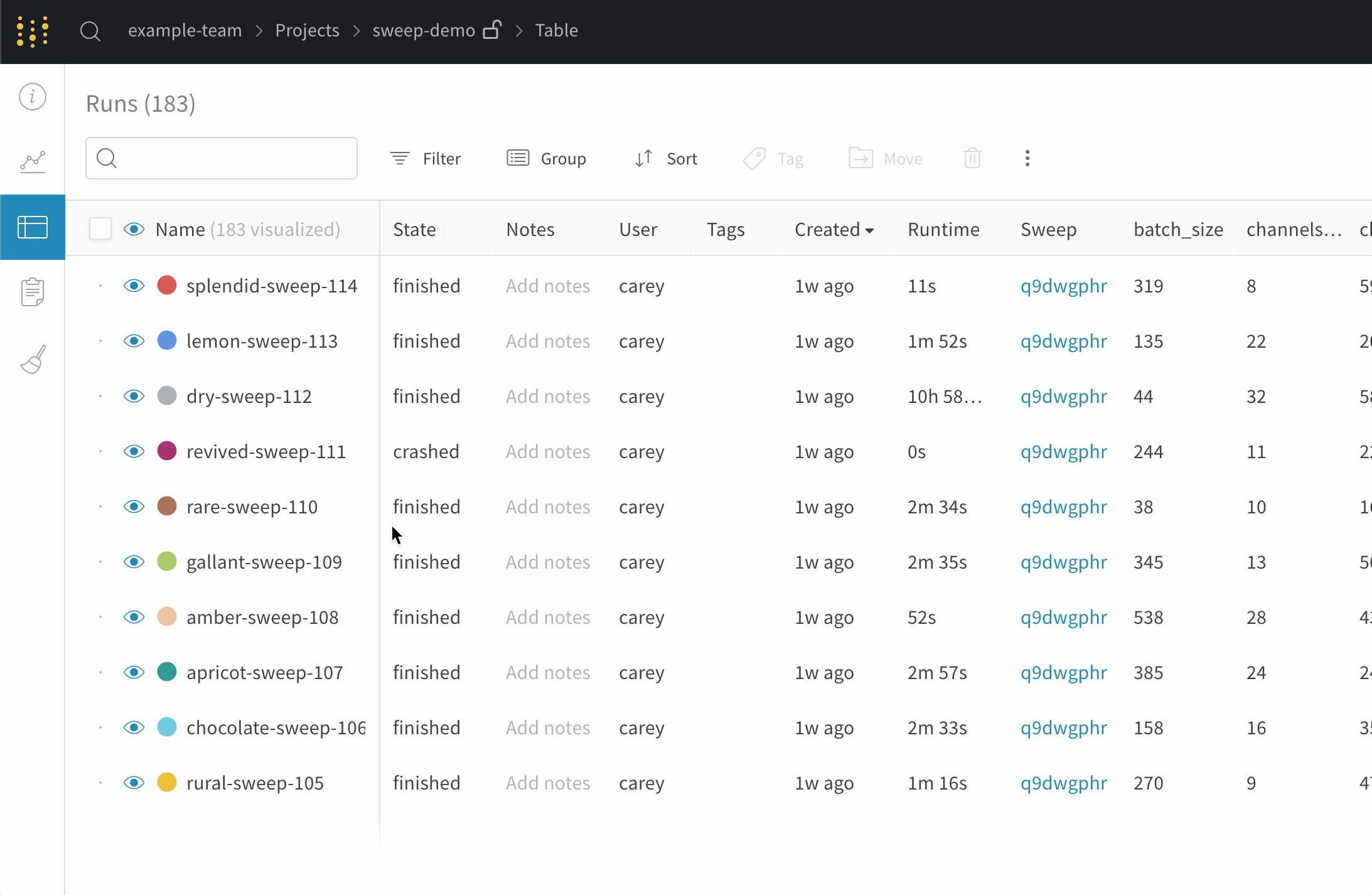 프로젝트 페이지에서 우리는 사이드바에서 run을 보여줍니다. 사이드바를 확장하여 표에서 run들의 하이퍼파라미터와 요약 메트릭을 확인하세요.