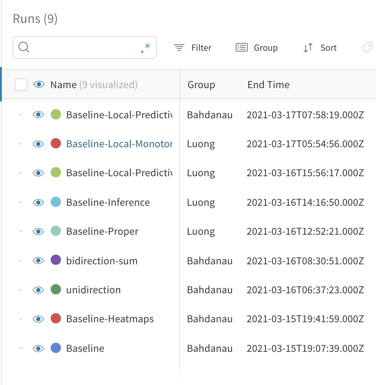 표에서 run 이름에 대한 전체 regex 검색을 지원합니다. 검색 상자에 쿼리를 입력하면 워크스페이스의 그래프에 보이는 가시적인 run들을 필터링하고 표의 행을 필터링합니다.