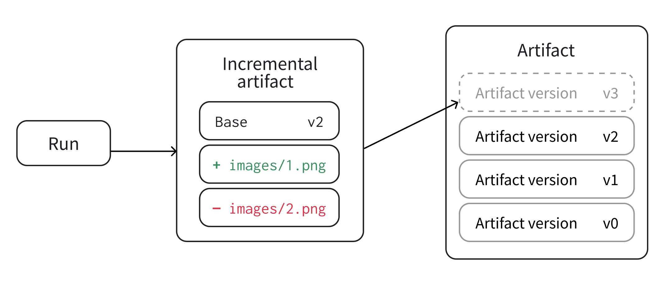 단일 run 또는 분산된 runs와 협업하여 새로운 아티팩트 버전을 생성하세요. 이전 버전에서 알려진 incremental artifact에서 새로운 아티팩트 버전을 선택적으로 생성할 수 있습니다.
